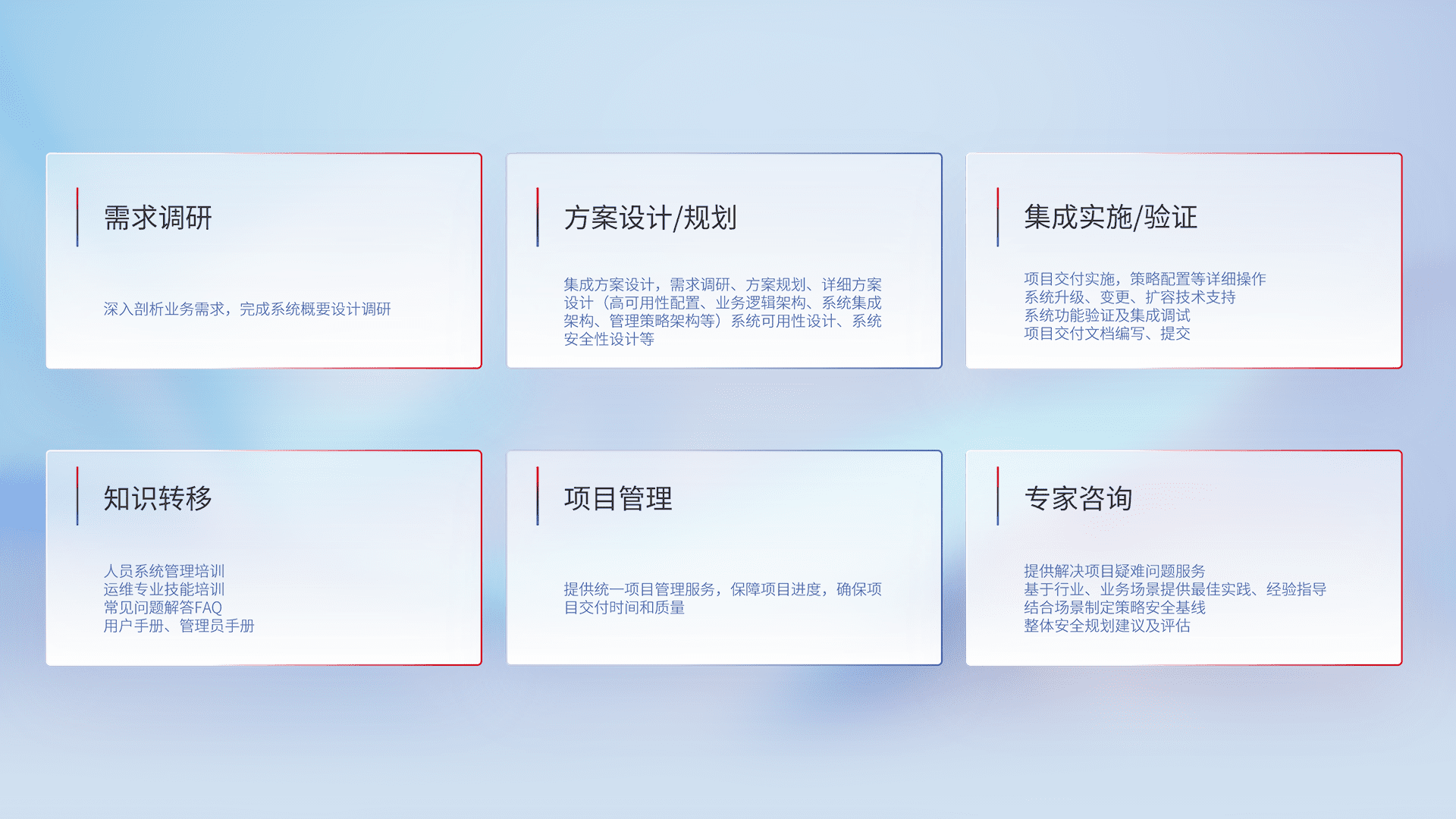 针对客户行业特性,,,将宏观的安全战略和需求,,通过专业的交付服务,,,,实现项目落地,,为客户提供标准规范的集成交付服务。。。